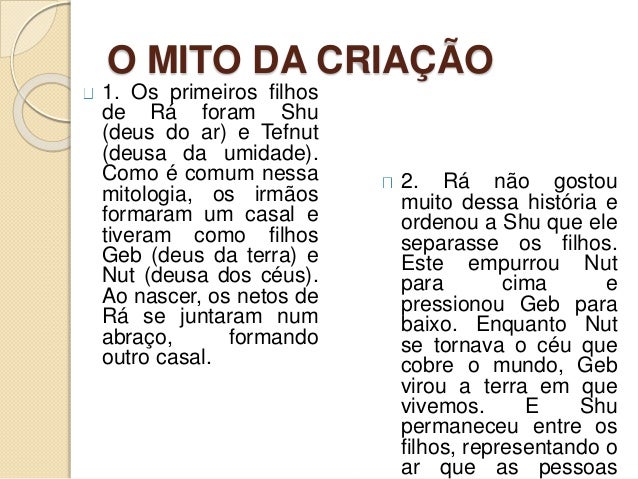 Os primeiros filhos de Rá foram Shu (deus do ar) e Tefnut (deusa da umidade). Como é comum nessa mitologia, os irmãos formaram um casal e tiveram como filhos Geb (deus da terra) e Nut (deusa dos céus). Ao nascer, os netos de Rá se juntaram num abraço, formando outro casal. 2. Rá não gostou muito dessa história e ordenou a Shu que ele separasse os filhos. Este empurrou Nut para cima e pressionou Geb para baixo. Enquanto Nut se tornava o céu que cobre o mundo, Geb virou a terra em que vivemos. E Shu permaneceu entre os filhos, representando o ar que as pessoas
