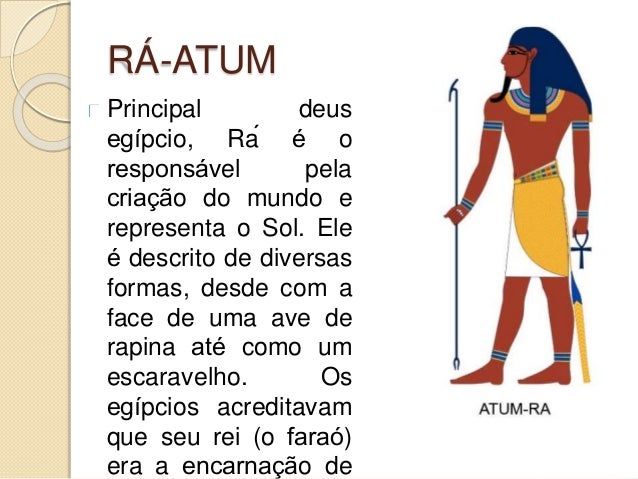 Principal deus egípcio, Rá é o responsável pela criação do mundo e representa o Sol. Ele é descrito de diversas formas, desde com a face de uma ave de rapina até como um escaravelho. Os egípcios acreditavam que seu rei (o faraó) era a encarnação de OSÍRIS Descendente direto de Rá (o deus da criação)