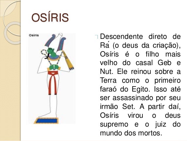 Descendente direto de Rá (o deus da criação), Osíris é o filho mais velho do casal Geb e Nut. Ele reinou sobre a Terra como o primeiro faraó do Egito. Isso até ser assassinado por seu irmão Set. A partir daí, Osíris virou o deus supremo e o juiz do mundo dos mortos.