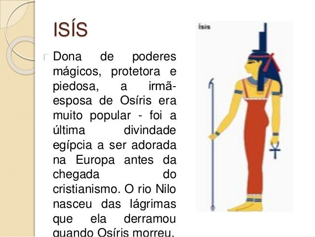 Dona de poderes mágicos, protetora e piedosa, a irmã- esposa de Osíris era muito popular - foi a última divindade egípcia a ser adorada na Europa antes da chegada do cristianismo. O rio Nilo nasceu das lágrimas que ela derramou