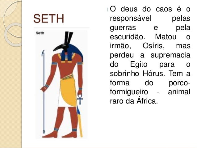 O deus do caos é o responsável pelas guerras e pela escuridão. Matou o irmão, Osíris, mas perdeu a supremacia do Egito para o sobrinho Hórus. Tem a forma do porco- formigueiro - animal raro da África.