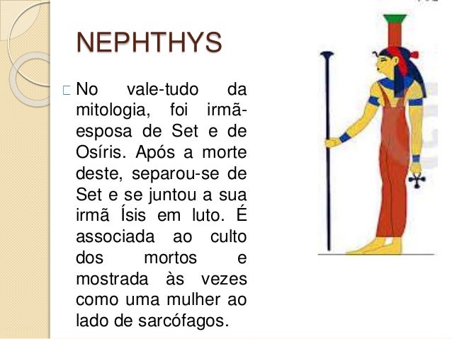 No vale-tudo da mitologia, foi irmã- esposa de Set e de Osíris. Após a morte deste, separou-se de Set e se juntou a sua irmã Ísis em luto. É associada ao culto dos mortos e mostrada às vezes como uma mulher ao lado de sarcófagos.