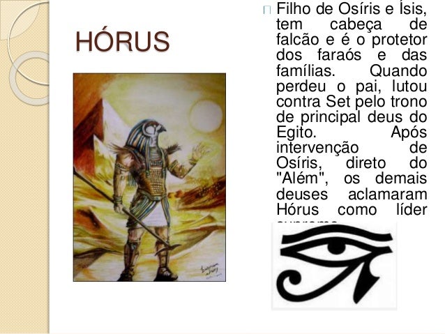 Filho de Osíris e Ísis, tem cabeça de falcão e é o protetor dos faraós e das famílias. Quando perdeu o pai, lutou contra Set pelo trono de principal deus do Egito. Após intervenção de Osíris, direto do "Além", os demais deuses aclamaram Hórus como líder supremo.