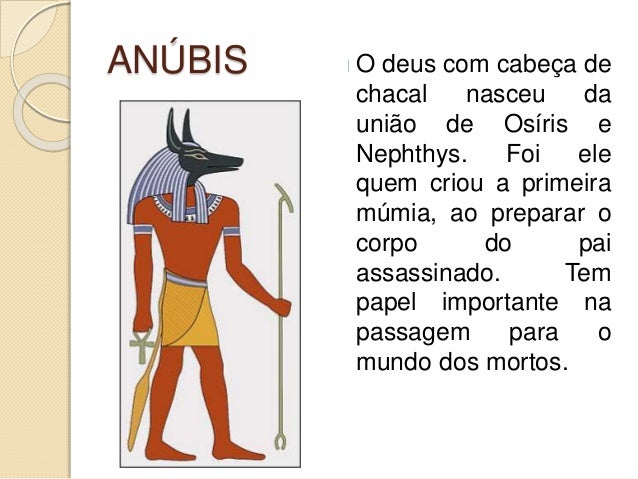 O deus com cabeça de chacal nasceu da união de Osíris e Nephthys. Foi ele quem criou a primeira múmia, ao preparar o corpo do pai assassinado. Tem papel importante na passagem para o mundo dos mortos.